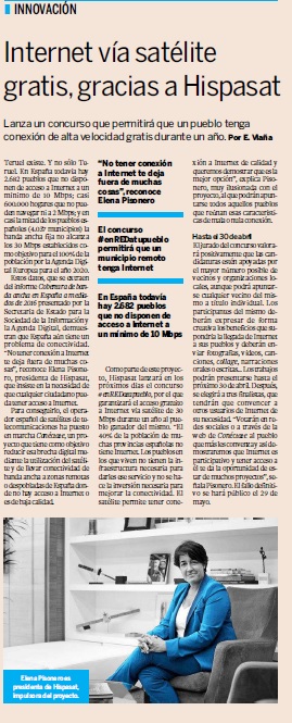 Como parte de este proyecto, Hispasat lanzará en los próximos días el concurso #enREDatupueblo, por el que garantizará el acceso gratuito a Internet vía satélite de 30 Mbps durante un año al pueblo ganador del mismo. “El 40% de la población de muchas provincias españolas no tiene Internet. Los pueblos en los que viven no tienen la infraestructura necesaria para darles ese servicio y no se hace la inversión necesaria para mejorar la conectividad. El satélite permite tener cone-xión a Internet de calidad y queremos demostrar que es la mejor opción”, explica Pisonero, muy ilusionada con el proyecto, al que podrán apuntarse todos aquellos pueblos que reúnan esas características de mala o nula conexión.
